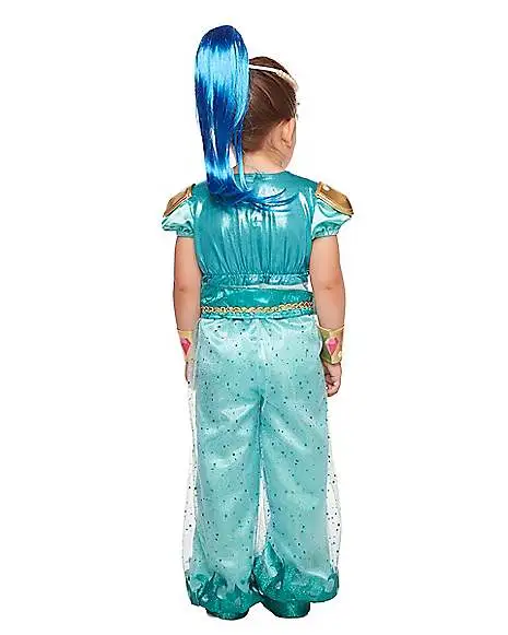 Your little girl will be sure to shine all day long in this Shine costume. One piece costume features sequined top with metallic cap sleeves. Mesh covering on the legs of the pants have polka dot glitter detail for added character and pizzazz. Add included wrist cuffs, hair piece, belt and head piece to complete your little one’s genie outfit!